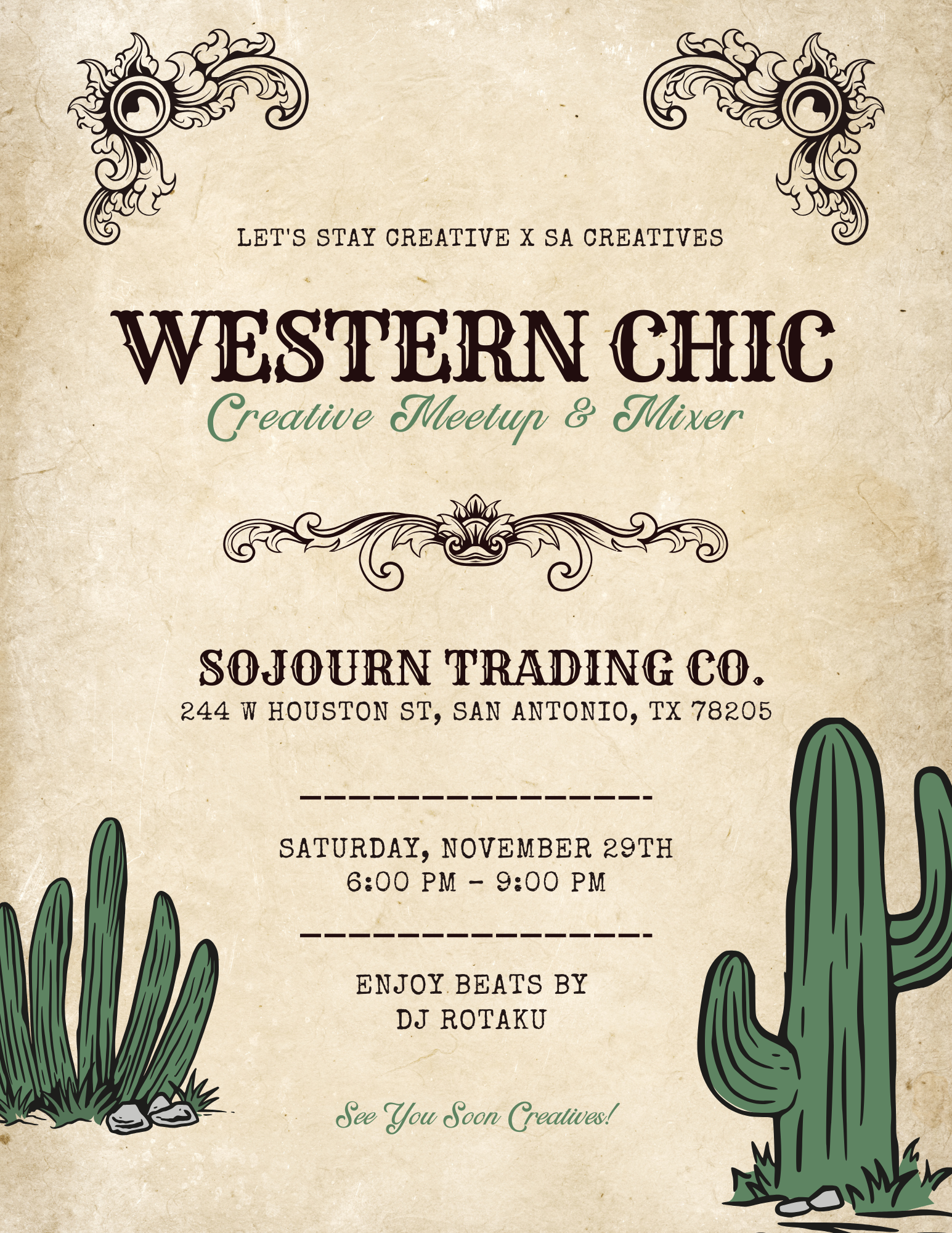 Join Let’s Stay Creative and SA Creatives for a night where art, fashion, and connection meet under a Western Chictheme.